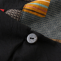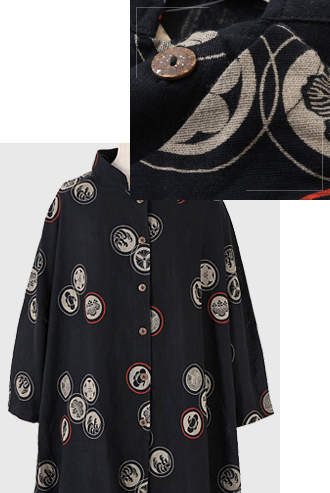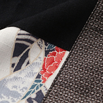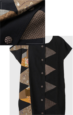 また、着物、のれん柄をヒントにした手染め、手織り布や大島布のはぎれをパッチワ-クにして服をキャンパスに見立てて、バランス良く貼り合わせてお洋服にし、一般的には高価とされる商品をお値頃価格でご提供しております。